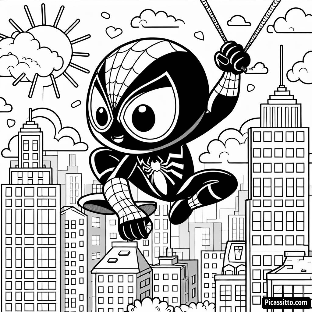 Скачайте эту бесплатную раскраску Человека-Паука, который качается через яркий городской пейзаж!